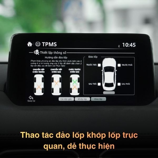 Điểm đặc biệt là giao diện cảm ứng mượt trên màn zin Mazda của Ellisafe J43 có độ phản hồi cao, cho phép người dùng tương tác trực tiếp trên màn hình để xem chi tiết từng bánh xe hoặc tùy chỉnh thông số.